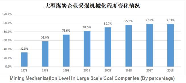 煤炭生產(chǎn)方面,從1978年至2019年,大型煤炭企業(yè)采煤機械化程度由32%提高到96%;全國煤礦人均生產(chǎn)效率由137噸/年提高到1000噸/年;建成了年產(chǎn)120萬噸及以上的大型現(xiàn)代化煤礦1200處左右,煤炭產(chǎn)量占全國的80%以上;建成了千萬噸級煤礦42處,產(chǎn)能6.7億噸/年。