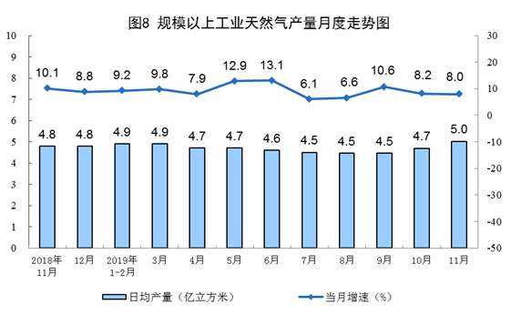 11月份,天然氣生產151億立方米,同比增長8.0%,增速比上月回落0.2個百分點;日均產量達到5.0億立方米,環(huán)比增加0.3億立方米。1—11月份,天然氣生產1575億立方米,同比增長9.2%。