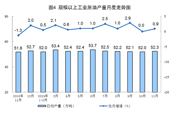 11月份,原油生產1570萬噸,同比增長0.9%,增速比上月加快0.9個百分點;日均產量52.3萬噸,環(huán)比增加0.3萬噸。1—11月份,原油生產17495萬噸,同比增長1.0%。