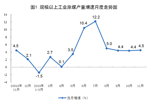 11月份,原煤產量3.3億噸,同比增長4.5%,增速比上月加快0.1個百分點;日均產量1114萬噸,環(huán)比增加66萬噸。1—11月份,原煤產量34.1億噸,同比增長4.5%。
