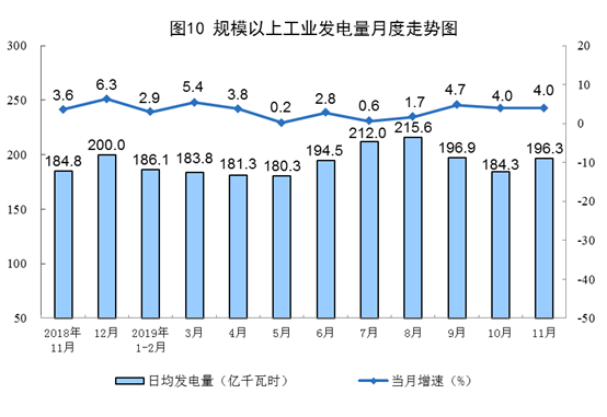 分品種看,11月份火電生產增速放緩,水電降幅擴大,核電、風電加快,太陽能發(fā)電略有放緩。其中,火電同比增長4.4%,增速比上月回落1.5個百分點;水電下降6.4%,降幅擴大2.3個百分點;核電、風電分別增長14.9%和20.7%,增速分別比上月加快9.5和10.7個百分點;太陽能發(fā)電增長2.7%,增速比上月回落0.3個百分點。