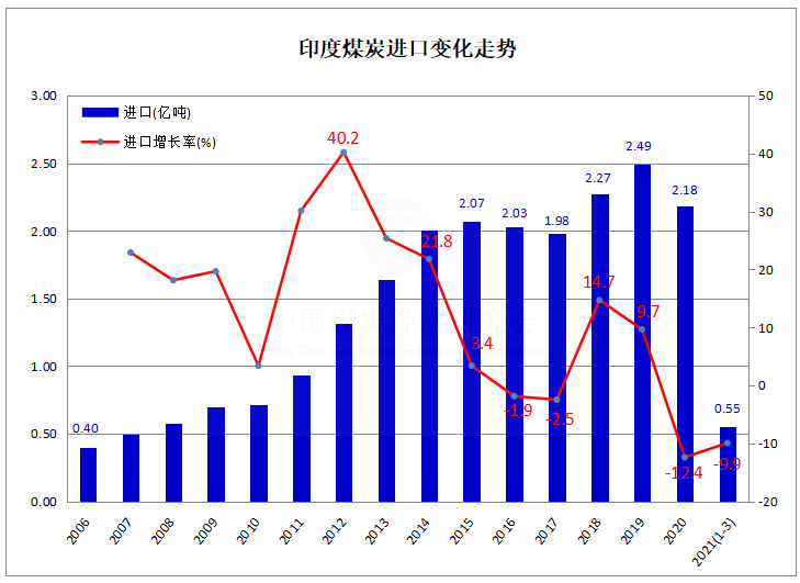 據(jù)印度mjunction平臺初步統(tǒng)計數(shù)據(jù)顯示,2020-21財年(2020年4月-2021年3月),印度煤炭進口2.16億噸,比上一財年的2.47億噸下降12.6%。其中,非煉焦煤進口1.41億噸,比上一財年的1.7億噸下降17.4%;煉焦煤進口4944萬噸,比上一財年的4917萬噸微增0.6%。2021年1-3月,印度煤炭進口5513萬噸,比上年同期的61…