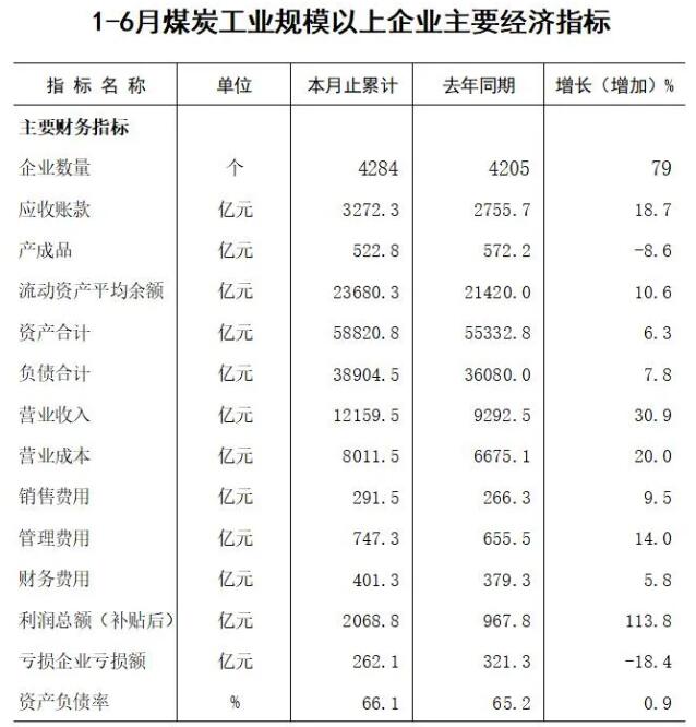 指標(biāo)顯示,上半年4284家規(guī)模以上煤炭企業(yè)營業(yè)收入12159.5億元,同比增長30.9%,增幅比規(guī)模以上工業(yè)行業(yè)平均高3個百分點(diǎn);營業(yè)成本8011.5億元,同比增長20.0%;應(yīng)收賬款3272.3億元,同比增長18.7%;利潤總額(補(bǔ)貼后)2068.8億元,同比增長113.8%。