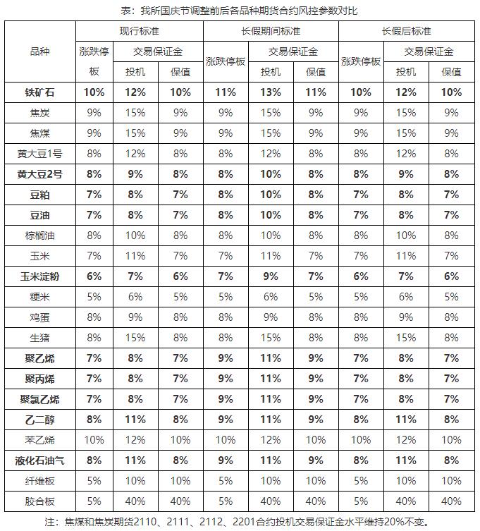 根據(jù)《大連商品交易所風(fēng)險(xiǎn)管理辦法》,經(jīng)研究決定,我所將在2021年國(guó)慶節(jié)休市前后對(duì)各品種期貨合約漲跌停板幅度和交易保證金水平做如下調(diào)整: