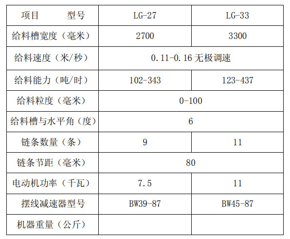 一、設(shè)備用途 LG 型鏈?zhǔn)浇o料機(jī)適用于煤炭、水泥、冶金和化工等待業(yè)為粒級(jí)為 0-100 毫米至混合松散物料的輸送設(shè)備。在選煤廠是與跳汰機(jī)相配套 使用的給煤設(shè)備。